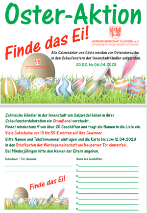 Die Salzwedeler Osteraktion findet vom 20.03. bis 06.04.2023 statt. Ausrichter ist wie in jedem Jahr die Salzwedeler Werbegemeinschaft. Die teilnehmenden Händler haben jeweils ein Straußenei in ihrer Schaufensterdekoration versteckt. Mit aufmerksamen Blick sind diese Eier schnell entdeckt. Den Namen des jeweiligen Geschäftes noch auf die Mitmach-Karte, die es hier zum Herunterladen oder bei den teilnehmenden Händlern gibt, eingetragen. Die Karte bis 12.04.2023 bei der Werbegemeinschaft (Am Neuperver Tor) abgeben und mit etwas Glück einen tollen Preis gewinnen.