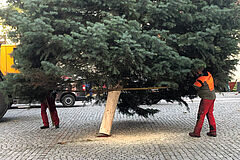 Der diesjährige Weihnachtsbaum auf dem Rathausturmplatz wurde mittels Spezialtransport abgeholt und durch einen Autokran aufgestellt.
