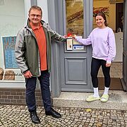 Brigita Enns, Inhaberin der Salzgrotte, und Bürgermeister Olaf Meining bringen den Konzept-Aufkleber an