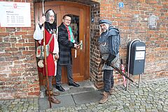 Bürgermeister Olaf Meining wurde in den Rathausturm gesperrt, gemeinsam mit seiner treuen Stadtwache von 1480. Doch der Bürgermeister kannte die Prozedur bereits und hatte einiges an kühlen Getränken bereitgestellt, mit denen er sich freikaufen konnte.
