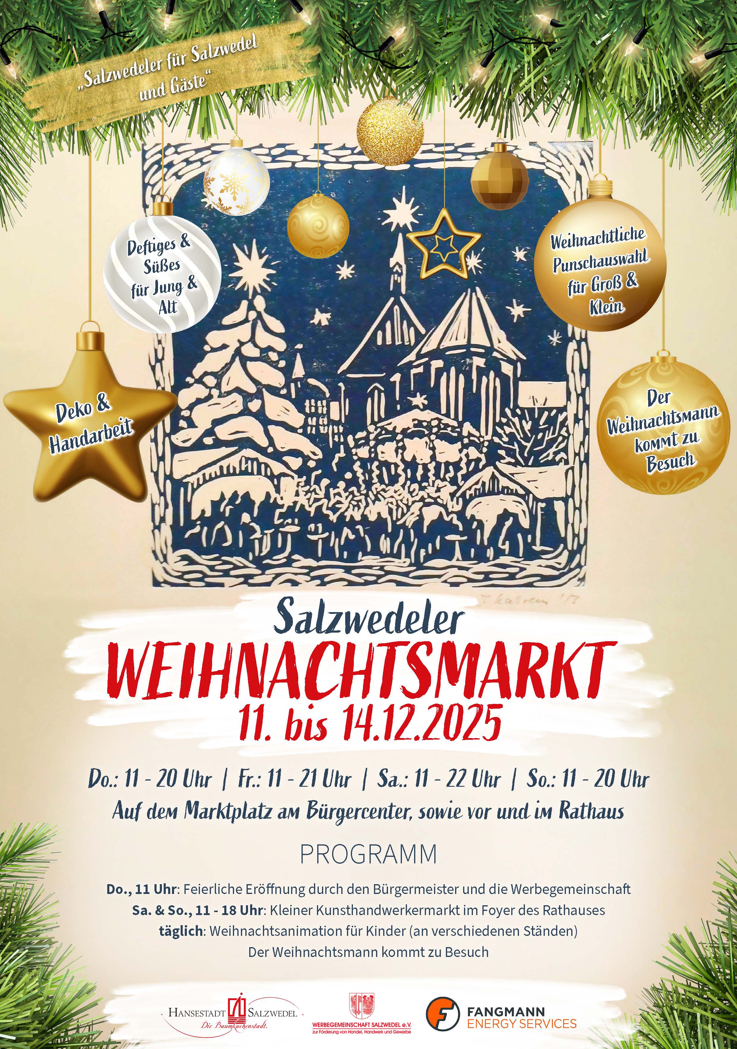 Der diesjährige Weihnachtsmarkt in der Hansestadt Salzwedel wird vom 11.12. bis 14.12. auf dem Marktplatz vor dem Bürgercenter stattfinden. Natürlich wieder mit Angeboten von heimischen Vereinen und Händlern.