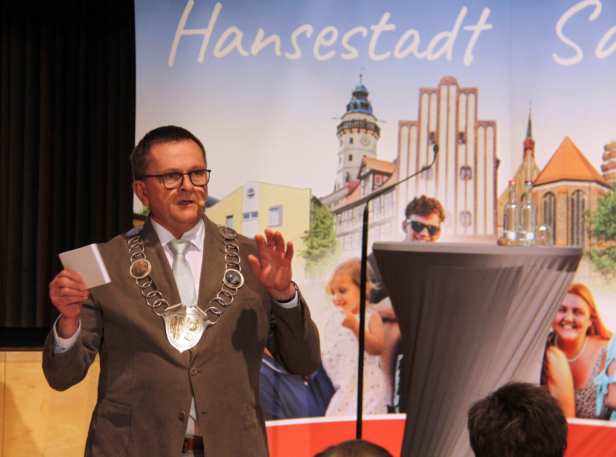 Der Jahresempfang der Hansestadt Salzwedel vereinte am Freitag, 13.03.2026, viele verschiedene Themen: so war natürlich der traditionelle Rückblick von Bürgermeister Olaf Meining, verbunden mit aktuellen Themen und seinem Ausblick auf geplante Schwerpunkte ein Kern des Empfangs. Doch zeigte auch Innenministerin Dr. Tamara Zieschang, verantwortlich für Inneres und Sport des Landes Sachsen-Anhalt Eckpunkte auf, die für unser Bundesland wichtig sind. Zivilschutz und damit einhergehend mehr Resilienz, sprich die Festigung der Zivilgesellschaft gegen Katastrophen und mehr Vorsorge. Auch die notärztliche Versorgung im Land, die bessere Festlegung der Hubschrauberstandorte waren Inhalte ihrer Rede, die sie vor einem vollen Kulturhaussaal hielt.