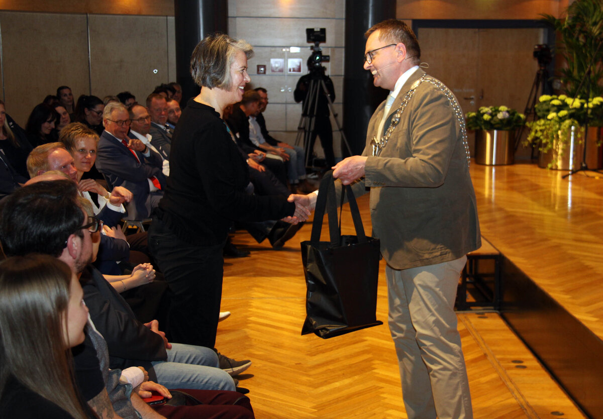 Die Präsentation der neuen Homepage der Hansestadt sowie des Kulturhauses und der Mönchskirche reihte sich ein in die vielen Überraschungen des Abends. Für viele Lacher sorgte das Geschenk von Bürgermeister Meining an Dr. Zieschang: eine schwarze Tasche. Dabei spielte Meining auf die Parteifarbe der Ministerin an (CDU-schwarz), allerdings trug die Tasche den Aufdruck der Salzwedeler Künstlerin, die das Accessoire entworfen hatte: "fröhliches Schwarz". Vielleicht, so der nicht ernst gemeinte Vorschlag des Bürgermeisters, ein künftiges Parteimotto...? Überrascht waren auch die Fachbereichsleiter seiner Verwaltung, die er alle einzeln aufrief. Denn er bedankte sich dafür, dass sie seine, so Meining wörtlich, "oft spontanen Eingebungen mitmachen und gut umsetzen." Einen großen Blumenstrauß erhielt dann die Person, die "mir zur Seite steht und ohne die ich das alles nicht schaffen würde": seine Frau Nadine. Langanhaltender Applaus des Publikums würdigte diese Geste.