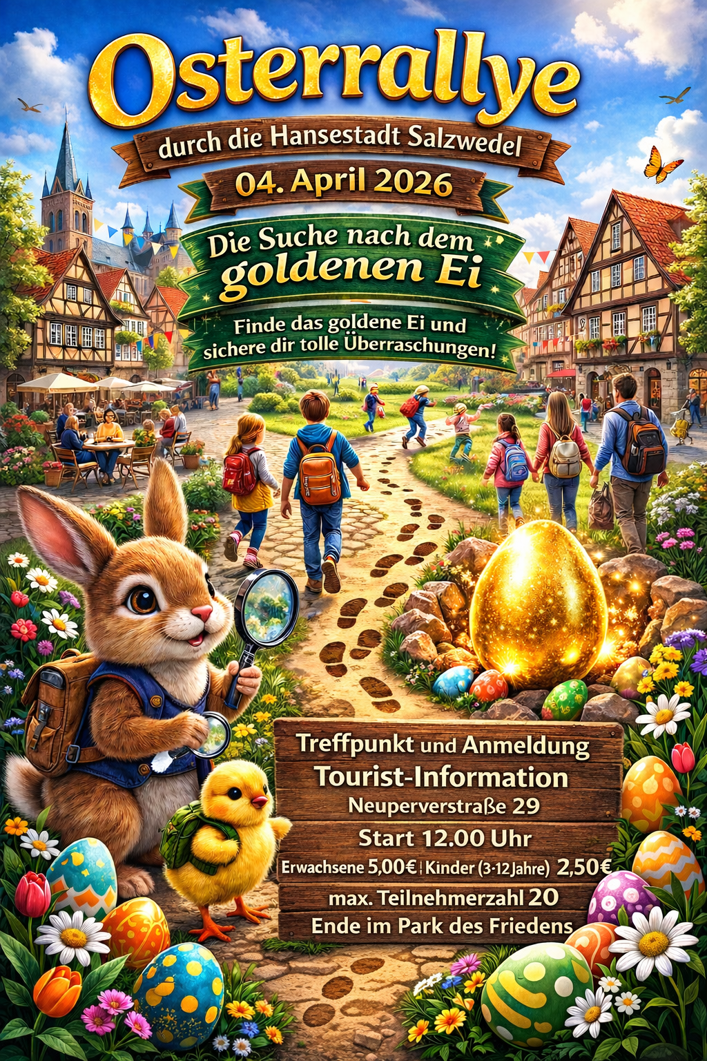 Die Tourist-Information der Hansestadt Salzwedel bietet zu Ostern eine Stadtführung der besonderen Art. Auf der „Osterrallye“ am 04.04.2026 durch unsere Stadt sind mehrere goldene Eier versteckt, die darauf warten, von aufmerksamen Gästen der Stadtführung entdeckt zu werden. In den Eiern sind Überraschungen versteckt. Aber keine Sorge: am Ende der „Osterrallye“ gibt es auch für diejenigen, die kein Goldenes Ei erspäht haben einen kleinen Trostpreis.