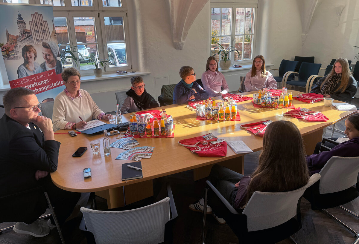 Eines der Highlights in der Stadtverwaltung war sicherlich der Blick in das Büro des Bürgermeisters. Zuvor begrüßte Olaf Meining die jungen Leute im Hansezimmer, gab einen kurzen Einblick in seine Aufgaben und äußerte seine Hoffnung, dass der eine oder andere der Besucher seine Interessen auf einen Ausbildungsberuf im Verwaltungsbereich sieht.