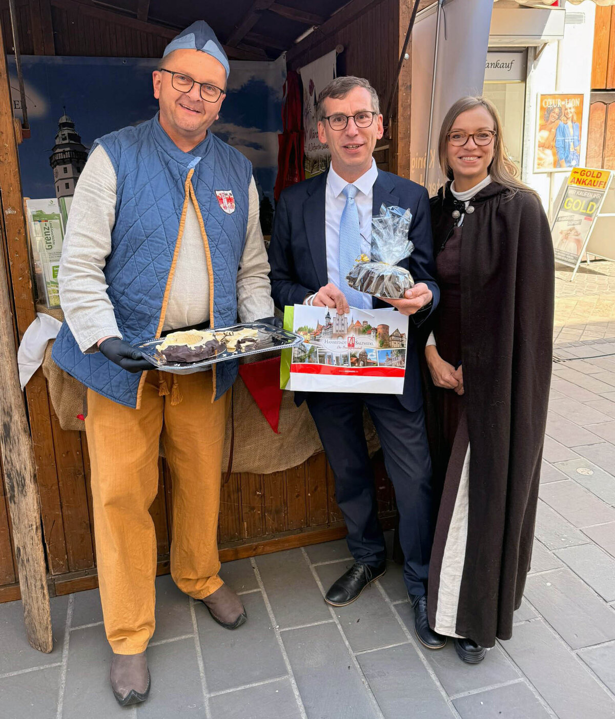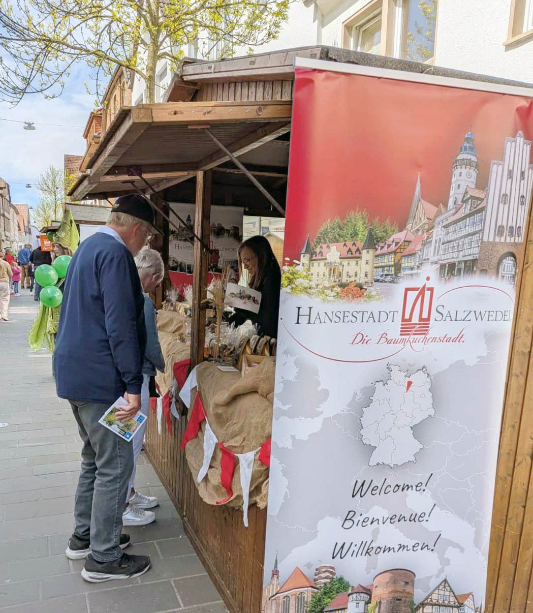 Die Hansestadt Warburg im Kreis Höxter in Nordrhein-Westfalen könnte man fast als Zwilling von Salzwedel bezeichnen: Mittelalterliches Flair, eine Doppelstadt, die erst nach längerer Zeit zu einer Stadt vereint wurde, eine ähnliche Einwohnerzahle und natürlich das hanesatische Erbe, welches gepflegt wird. Die Gemeinsamkeiten sind nicht von der Hand zu weisen. Warburg richtet 2036 erstmals einen Internationalen Hansetag aus - und damit die rund 23.000 Einwohner zählende Stadt erste Erfahrungen sammelt, gibt es seit diesem Jahr das Hansefest in der Innenstadt. Ehrensache, dass eine Abordnung aus Salzwedel auch dabei war. Bürgermeister Olaf Meining und Tina Mierau, Leiterin des Tourismus, waren beim 1. Warburger Hansefest vom 24.04. - 26.04.2026 dabei, verteilten Info-Flyer über Salzwedel und die Altmark und gaben viele Tipps für Touristen. Ein echter Hingucker und auch geschmacklich ein Volltreffer war natürlich der bekannte Salzwedeler Baumkuchen, der von der Königlicher Salzwedeler Baumkuchen GmbH zur Verfügung gestellt wurde.