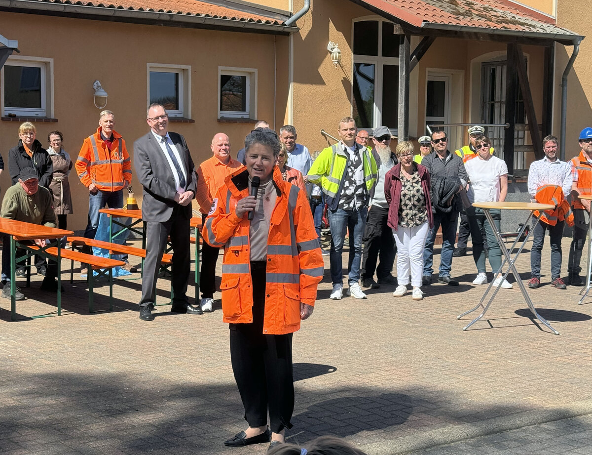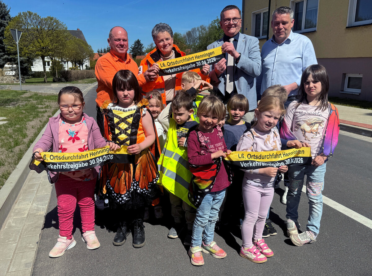 Hoher Besuch bei der Freigabe der Ortsdurchfahrt (OD) Henningen: die Ministerin für Infrastruktur und Digitales des Landes Sachsen-Anhalt, Lydia Hüskens nahm die Freigabe am Donnerstag, 30.04.2026, persönlich vor. Sie dankte den beteiligten Unternehmen für den professionellen und reibungslosen Ablauf der Straßenbaumaßnahme. Die Ministerin freute sich sichtlich über das große Interesse der Henninger - "wir haben hier mehr Besucher, als bei der Eröffnung einer Bundesstraße", sagte Hüskens.