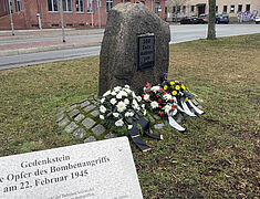 Landrat Steve Kanitz und Bürgermeister Olaf Meining legten jeweils ein Blumengebinde am Gedenkstein nieder. Auch läuteten an diesem Gedenktag um Ppunkt 12.10 Uhr die Kirchenglocken der Hansestadt und erinnerten damit an den Zeitpunkt, an dem die ersten Bomben fielen.